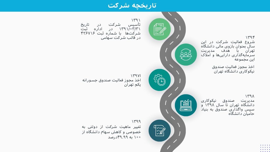 این شرکت فعالیت خود را در سال ۱۳۹۴ بعنوان بازوی مالی دانشگاه تهران و با هدف مدیریت سرمایهگذاری داراییها و املاک این مجموعه آغاز نمود و در سال ۱۳۹۴ و سال ۱۳۹۷به ترتیب موفق به اخذ مجوز فعالیت صندوق نیکوکاری دانشگاه تهران و صندوق جسورانه یکم دانشگاه تهران گردید و از آن تاریخ مدیریت صندوقها را برعهده داشته که البته مدیریت اجرایی صندوق نیکوکاری دانشگاه در سال ۱۳۹۸ به بنیاد حامیان دانشگاه واگذار شدهاست.