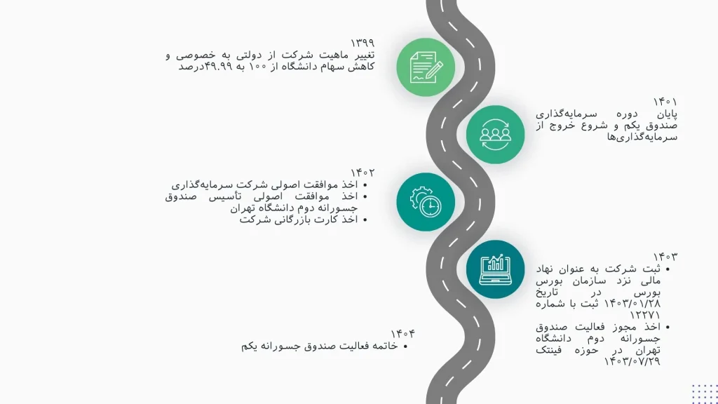 این شرکت در سال ۱۴۰۳ موفق به اخد مجوز فعالیت صندوق جسورانه دوم دانشگاه تهران با مجوز فرابورس گردید و در سال ۱۴۰۴ نیز با خروج از همه سرمایه گذاری های صندوق جسورانه یکم دانشگاه تهران، به عنوان اولین مدیر صندوق های جسورانه در کشور، موفق به خاتمه فعالیت این صندوق گردید.