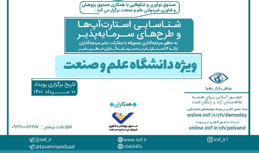 یکی از مسیرهایی که صندوق نوآوری و شکوفایی جهت توسعه اکوسیستم نوآوری و شکوفایی کشور آغاز نموده است، برگزاری رویداد “دوشنبه های استارتاپی و پیوند” است. هدف اصلی این رویداد...